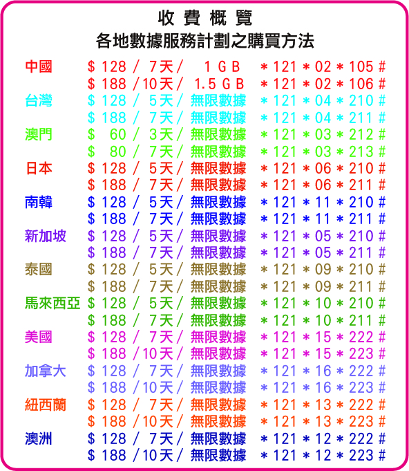 收費 | 有效期 | 數據用量 | 簡易購買短碼 |
